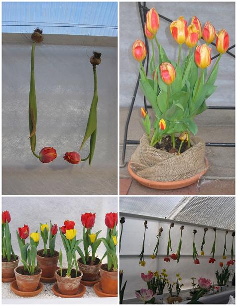 Kolla in bilden högst upp till vänster med de 2 tulpanerna som dras mot varandra och ser ut att vara inbegripna i ett djupt samtal ! Hängande tulpaner i olika färger på rad, tulpaner enbart inslagna i lite jord i säckväv och flera likadana krukor som ger masseffekt.