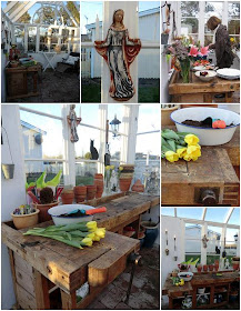 Idag har det blåst som sjutton här så det var mycket skönare att kura i växthuset istället (som blivit ett riktigt pysselhus) ! Det är helt UNDERBART att kunna bre ut sig med sina pysselgrejor ... lämna alltihop när orken och lusten tar slut ... för att sedan börja om igen när andan faller på !