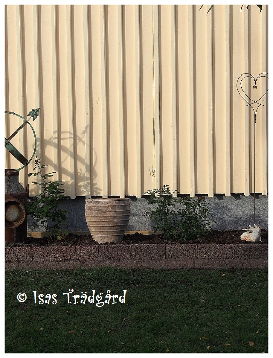 Jubilée Celebration kom också i jorden i dag och det var ett styvt jobb att få ur rosen ur sin kruka där hon bott in sig hela sommaren. Nu är hon i alla fall planterad och krukan tom. Kanske flyttar det in en ny ros nästa sommar. Finns stor risk när vi besöker Österlen igen.